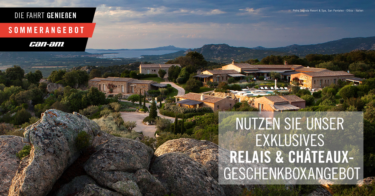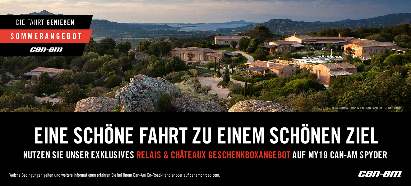 Beim Can-Am Spyder geht es darum Abenteuer zu erleben, die Welt zu erkunden und Erinnerung zu schaffen. Und genau deswegen, schafft BRP nicht nur einen Weg, sondern auch ein Ziel. Entdecken Sie mit Ihrem neuen Weggefährten neue Orte in ganz Europa. Nach dem Kauf erhalten Sie innerhalb 3 Wochen Ihre persönliche Geschenkbox - Das Ziel wählen ganz allein Sie! Die Aktion ist bis zum 21. Juli gütlig und gilt auf alle Can-Am Sypder Modelle vom Modelljahr 2019 - Also nichts wie ran und freuen Sie sich auf die Geschenkbox von Relais & Châteaux Geschenkbox Creation N°23 und machen Sie Ihre erste Fahrt zu etwas ganz besonderen. |